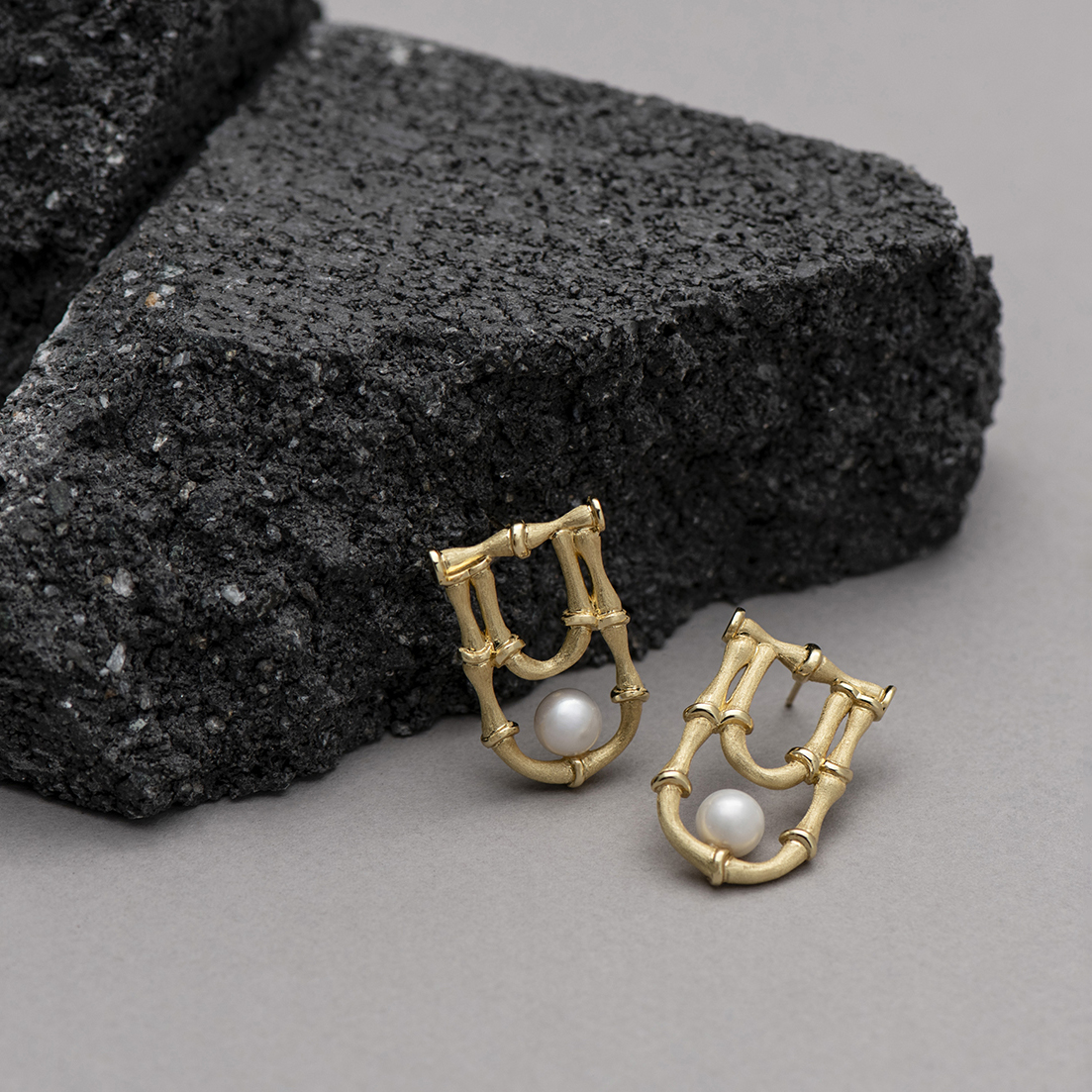 Sculptural 18k gold plated sterling silver bamboo earrings featuring a single centered pearl — modern with an organic touch.