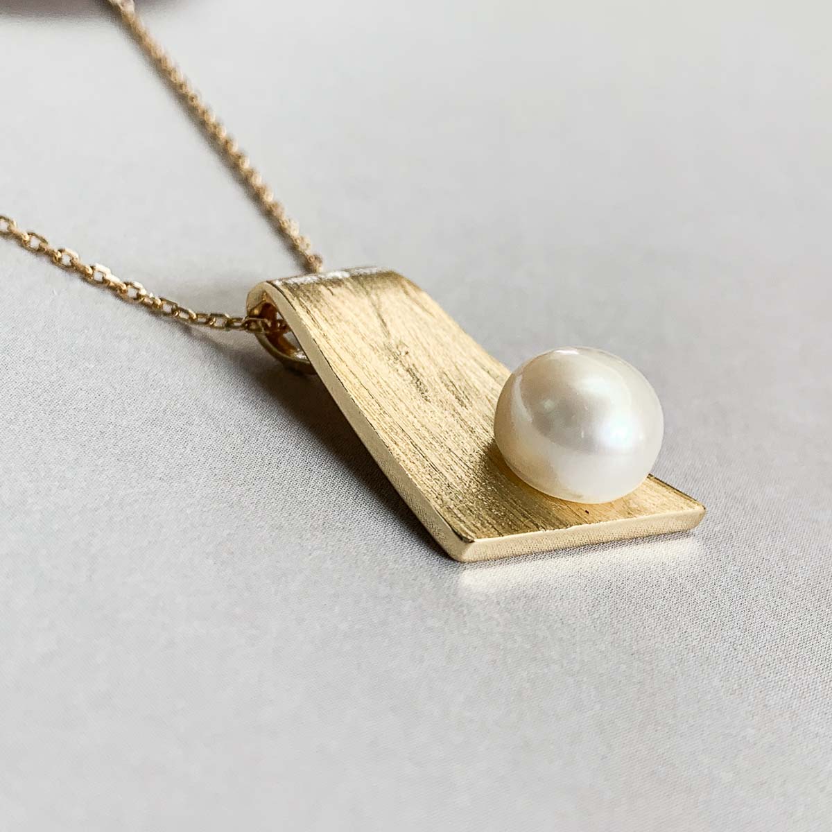 These stylish earrings feature brushed 18k gold-plated sterling silver triangular shapes with a sleek, angled design. Each earring is adorned with a luminous freshwater pearl at the base, creating a striking contrast between the bold, modern design and the classic elegance of the pearl.