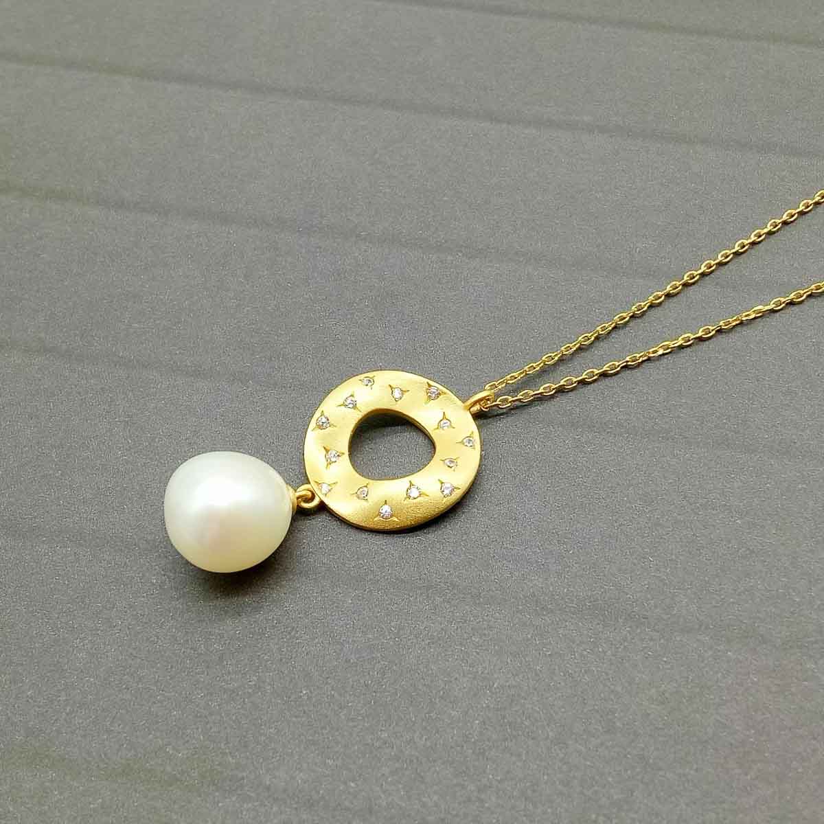 These elegant earrings feature a 18k gold-plated sterling silver circular design with delicate sparkling stones around the edges. In the center, an open circular cut-out holds a white freshwater pearl, hanging beautifully beneath. The design combines the shine of gold with the natural luster of the pearl for a sophisticated and refined look.
