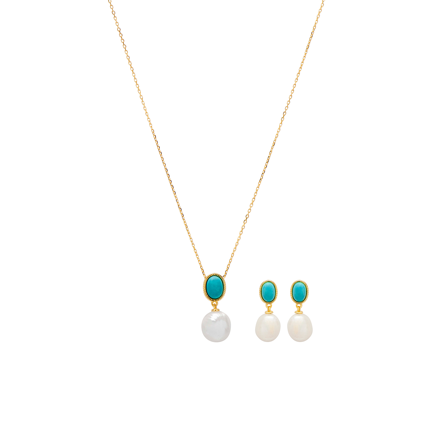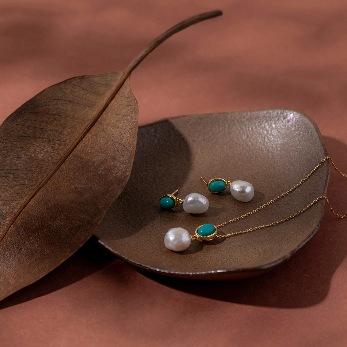 These elegant earrings feature a combination of freshwater pearls and turquoise stones, creating a perfect blend of elegance and color.