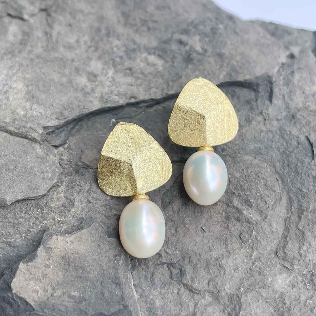 These elegant stud earrings feature a textured, gold-plated geometric design with a soft, organic shape. Below the golden base, a lustrous freshwater pearl adds a sophisticated touch, creating a refined and modern aesthetic.