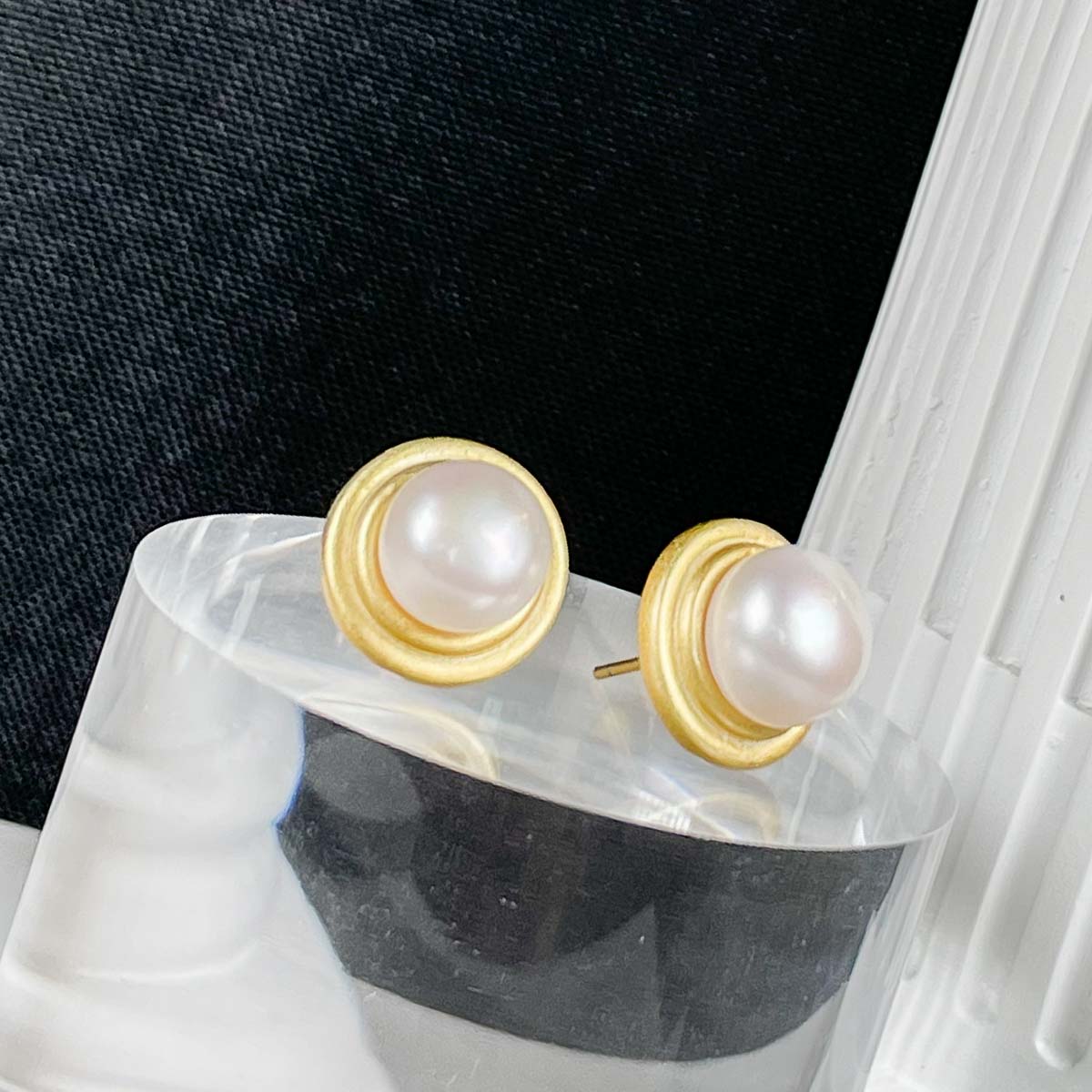 These elegant stud earrings feature luminous freshwater pearls, beautifully framed in a 18k gold-plated sterling silver bezel. The classic design adds a sophisticated touch to any look, making them perfect for both everyday wear and special occasions.