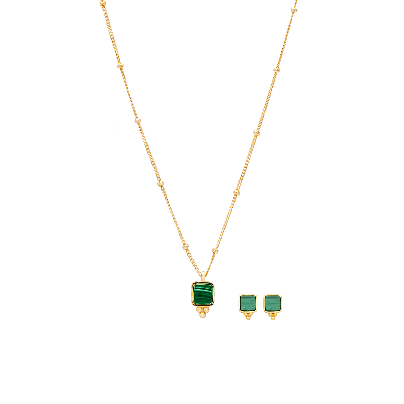 Gold-tone stud earrings featuring rectangular green malachite stones with delicate bead accents.