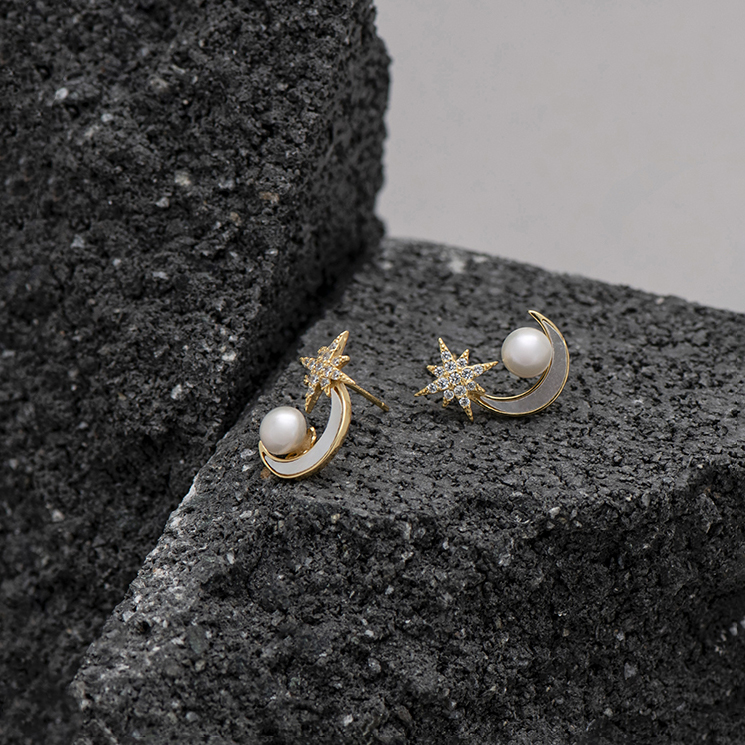 These stunning earrings feature a crescent moon design with a lustrous pearl and a dazzling star, set in gold. A perfect blend of elegance and celestial charm, making these earrings a statement piece.