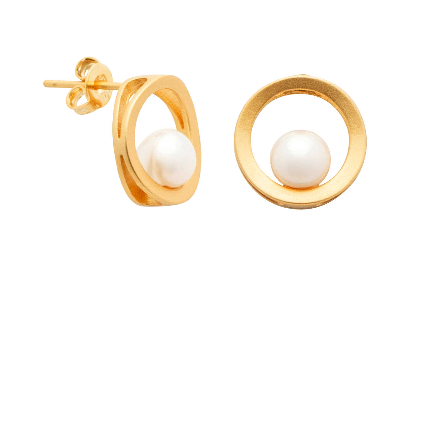 An offset freshwater pearl is set on its symmetric orbit, nestled into a gold halo pendant.
